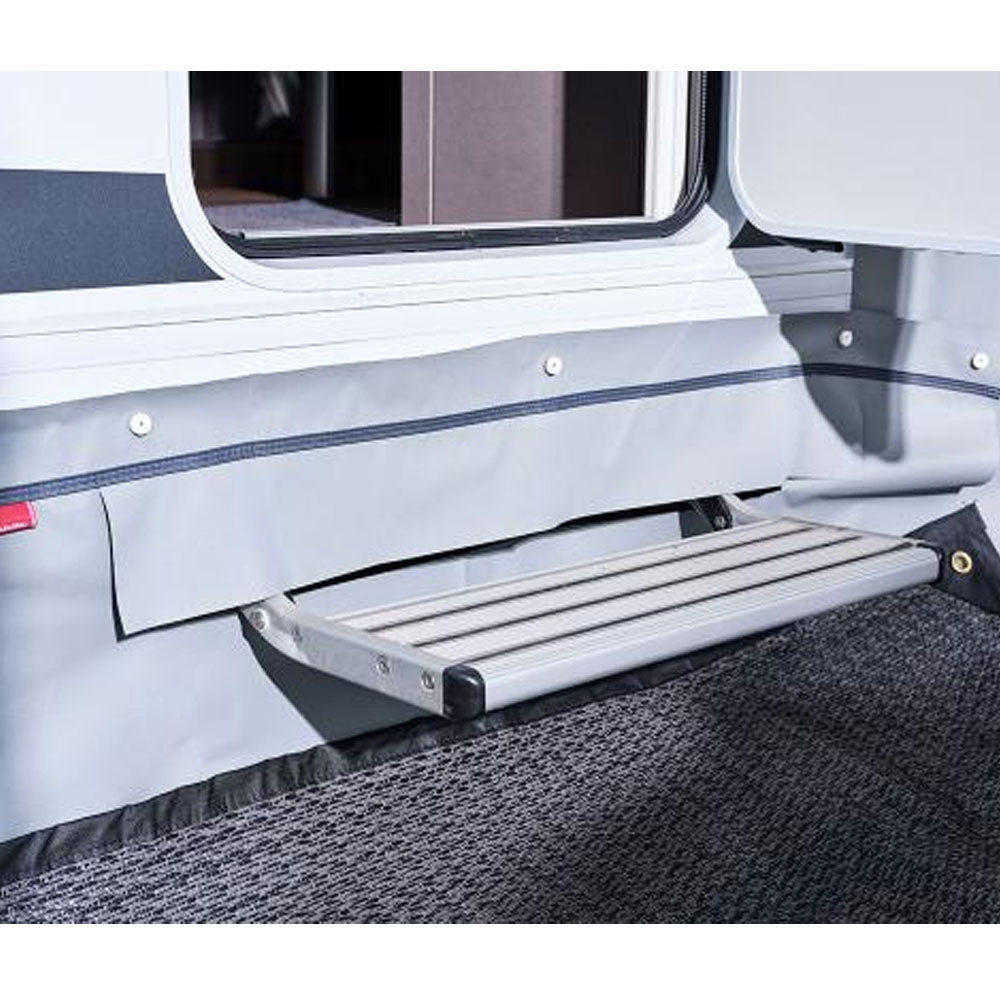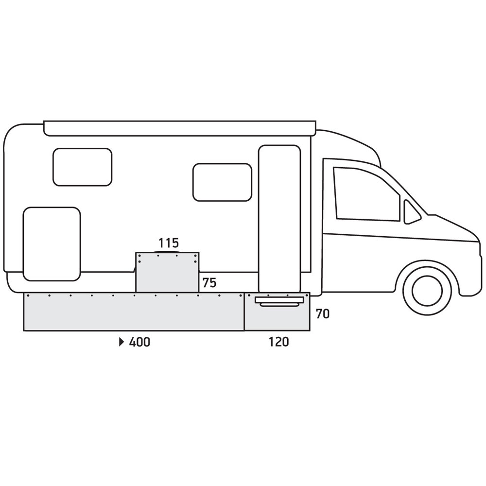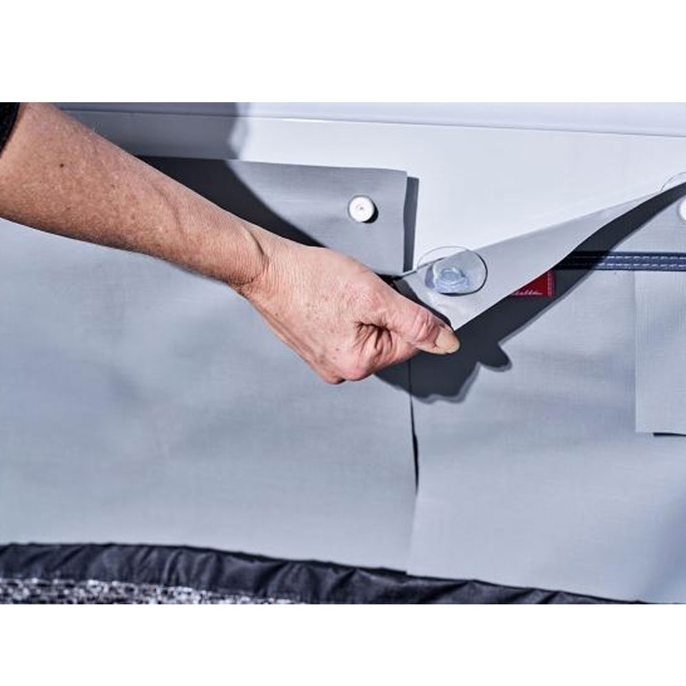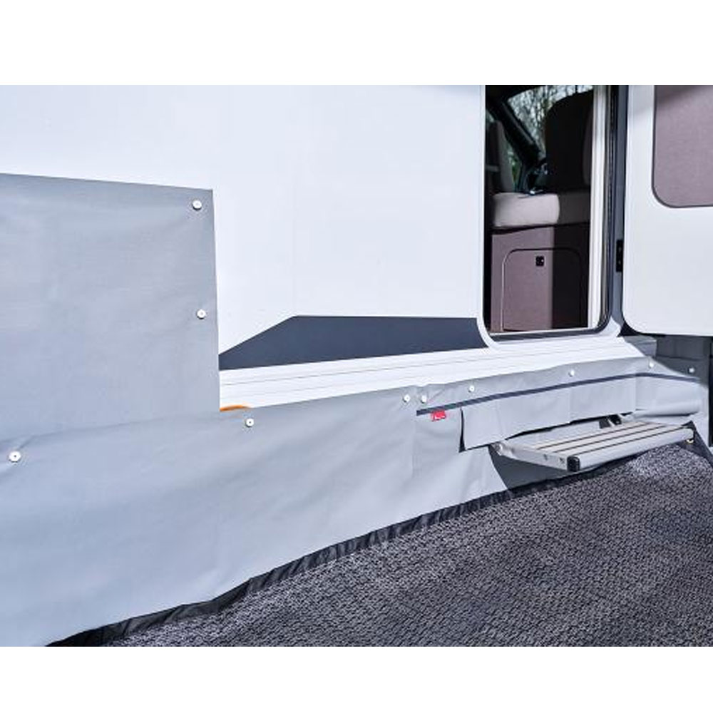 Skapa en bekvämare utomhusmiljö vid din husbil med detta praktiska och hållbara understycke. Understycket tätar effektivt utrymmet mellan hjulen och förhindrar irriterande drag och kyla när du befinner dig under markisen. Perfekt för campingresor där mysighet och komfort står i fokus. Underlaget är tillverkat av slitstarkt PVC 350 g/m², vilket garanterar lång livslängd och effektivt skydd mot vind och väder. Tack vare den smarta och skruvfria monteringen med sugkoppar kan du fästa underlaget utan att göra hål i din husbil. Pinnar medföljer för extra tight passform.